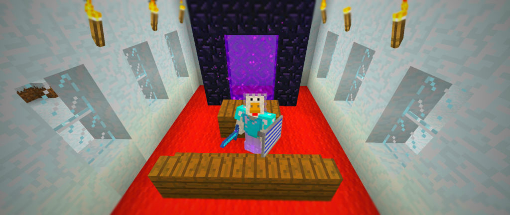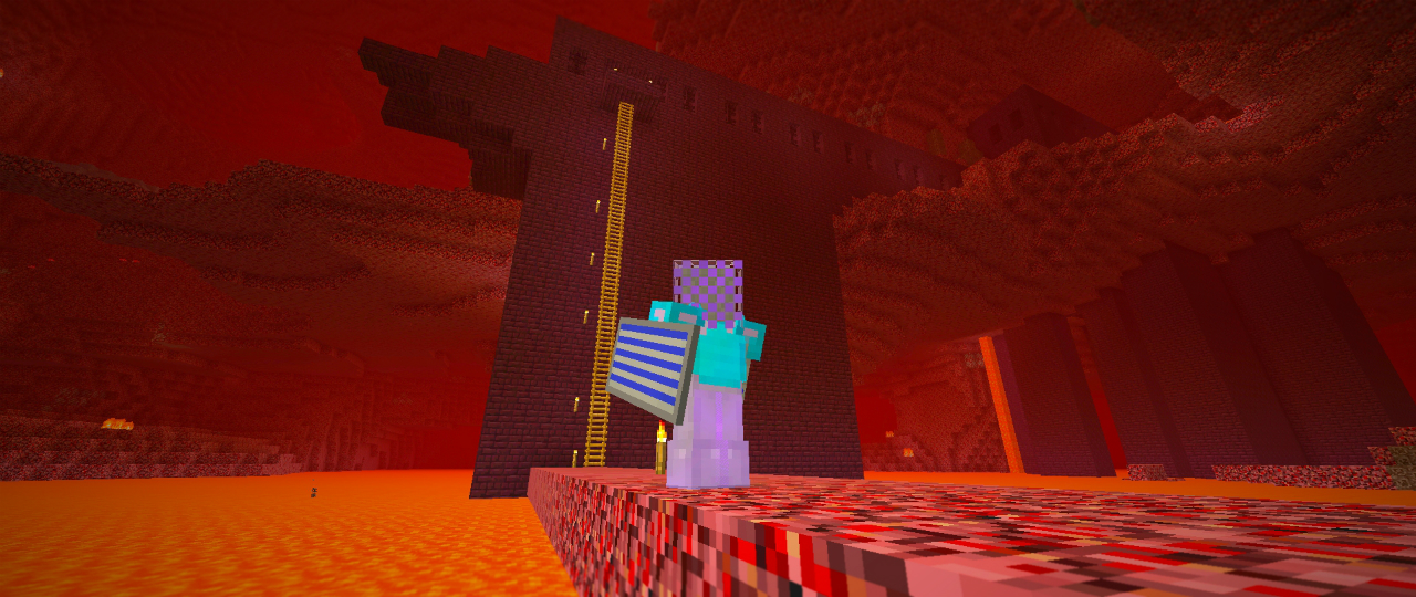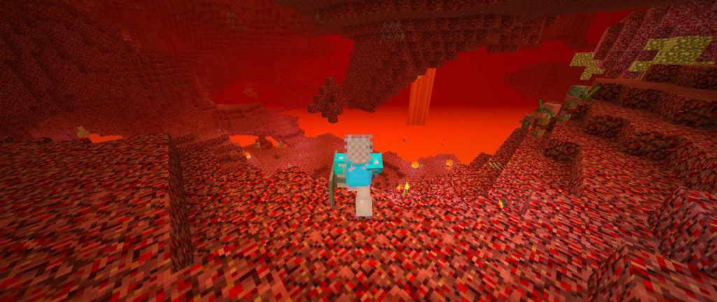 集落の外れに建てられた教会風の建物へ。内部に安置されているネザーゲートを起動させ、ずいぶんと久しぶりにネザーへと赴きます。紫色の靄をくぐると視界が歪み、意識が遠のいていきます。気がつけばそこは地獄じみた異世界。