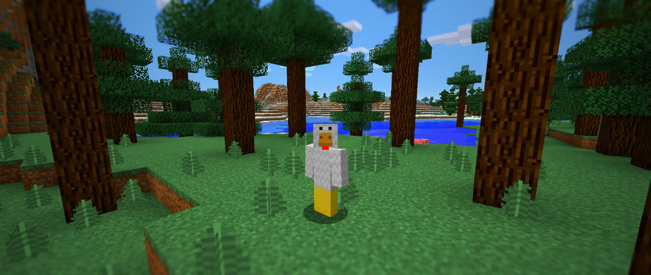 さて、画像でお分かりの通り針葉樹林のような場所にスポーンしました。奥に氷原がありその手前にみえる湖の一部が凍りついています。ちょっと寒々しい地形ですけれど、沼地の真ん中や木が1本もない孤島に生まれることを思えば贅沢は言えません。