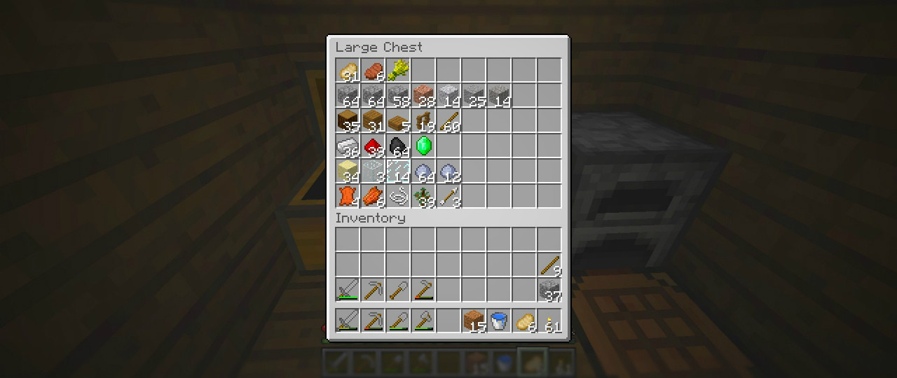 鉄36個・レッドストーン39個・エメラルド1個、そして石が3スタック(※1)ほど。当面必要になりそうな資材は十分に集まりました。石炭もたくさん手に入れましたし、これでカマドの燃料や松明に困ることもなさそうです。