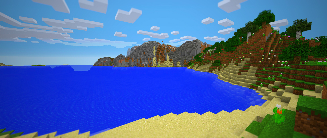 花の咲く美しい浜辺を見つけました。遠景に山が見えるのもポイントが高い。もし氷原にスポーンしなかったら、こんな感じの地形を探して拠点を作っていたことでしょう。