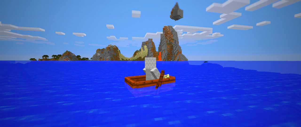 次の島へと調査の手を伸ばします。写真のような空中に浮かんだ岩塊、この世界ではよく見かけます。Minecraft独特の景観を作り上げるのに一役買っていますね。