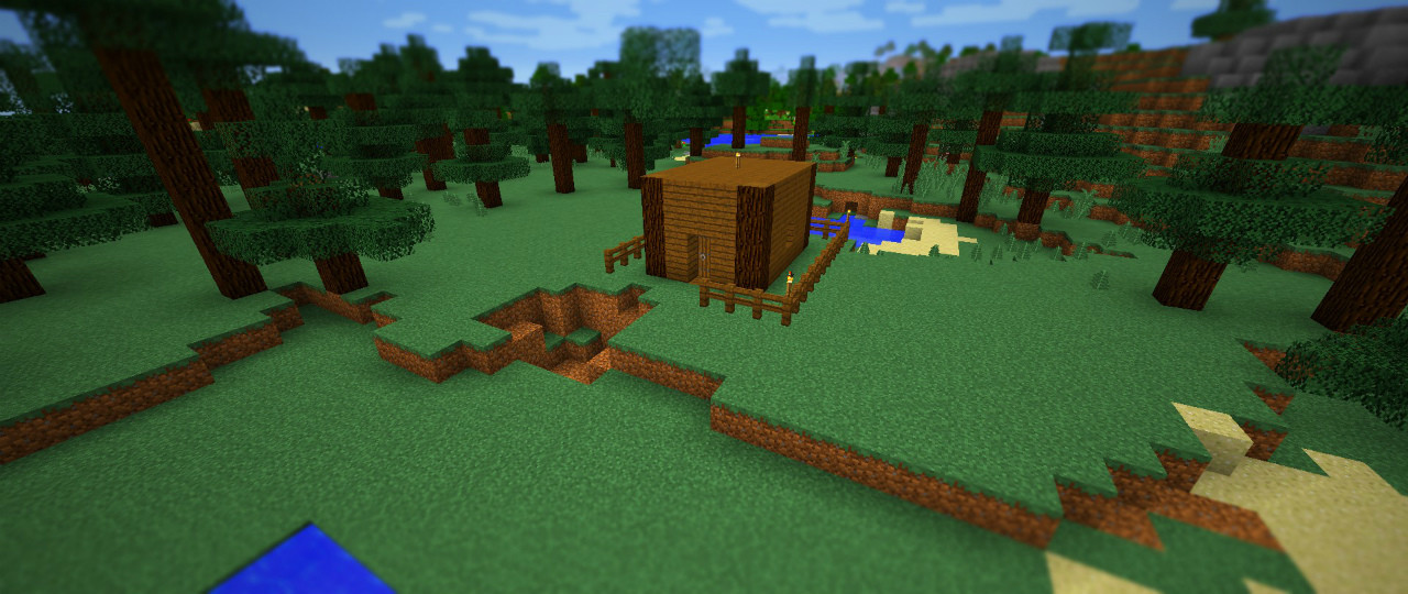 しばらくこの周辺で木や石、食料を集め、スポーン地点に建てた四角い小屋に貯め込みます。ある程度資材が集まったらキチンとした拠点を作りたいのですが、それはもう少し先のことになりそうです。
