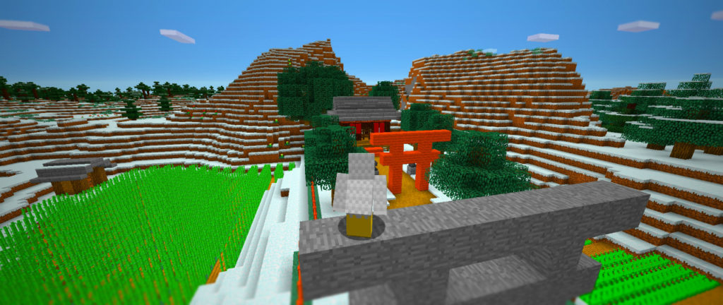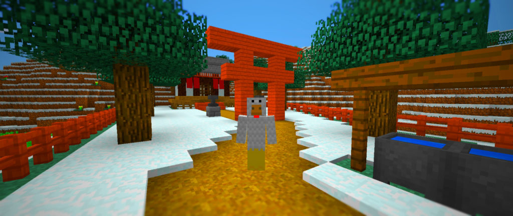 全体的なイメージを確認しながら作業を進めます。手水舎や狛犬に見立てたブロックを配置して、それらしい雰囲気を出していきましょう。境内がちょっと寂しいので、鳥居をもう一基増やしてみますか。