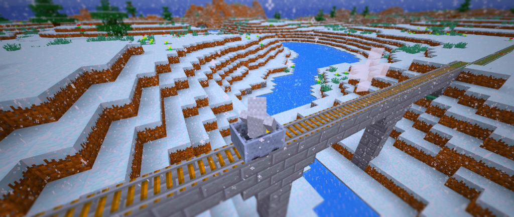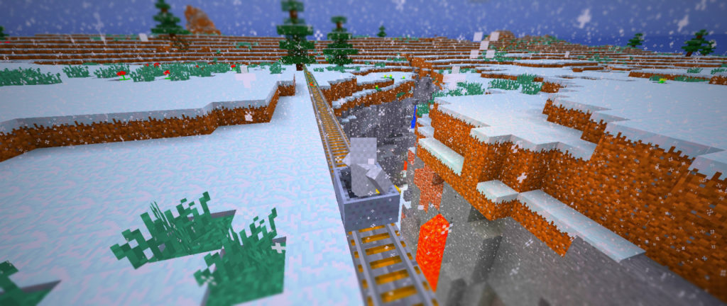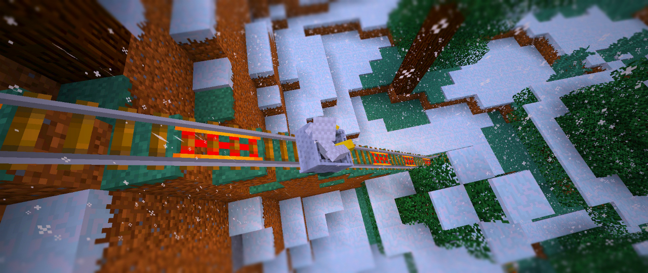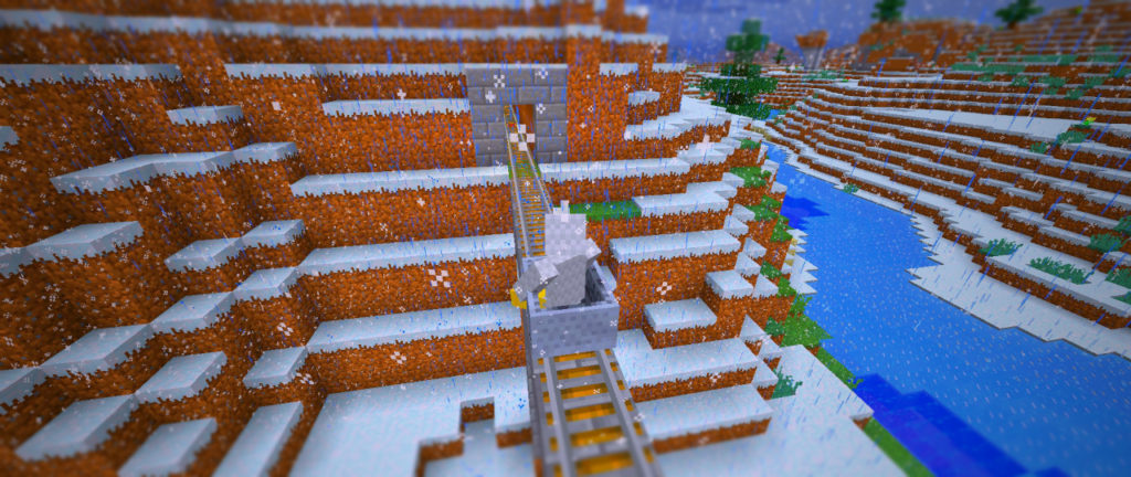 何日かかったことか……。かなり丁寧に作業したはずなので、途中で脱線事故を起こすような心配もないと思います。「トラップ前駅」からトロッコに乗り込み、さっそく試走してみましょう。先に経験値トラップを利用してレベルを30まで上げておいたので、集落に帰ったらすぐに「Frost Walker」のエンチャントをすることができます。