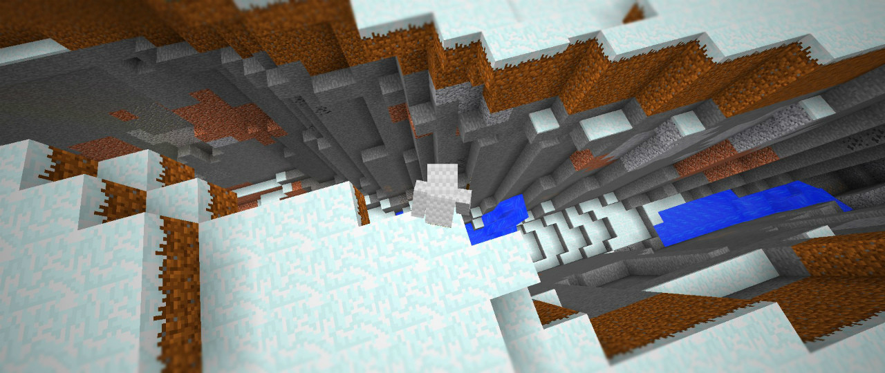 上の写真のような峡谷はわりとよくみかけられる地形です。地図などを見ながら歩いていると落下しがちなので注意が必要。谷底の暗がりに敵性Mobが湧いていることも多いです。
