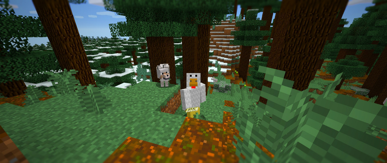 これは巨大な松の生えたタイガバイオームでしょうか。地面は苔石やポゾドル(※3)で覆われています。話には聞いていましたが見るのは初めて。なかなか迫力があります。