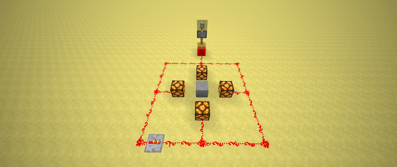 トラップにはレッドストーンランプを利用したストッパーをつけました。レバーを「ON」にするとスポーンブロックの周囲の壁に設置した照明が点灯し、沸きが停止します。下の画像は停止機構の試作品です。粘着ピストン(※1)とレッドストーンブロック(※2)を利用した、簡単なスイッチで、レバーを下げるとピストンがレッドストーンブロックを下方に押し、動力が伝わります。レバーを戻すとスイッチが切れます。