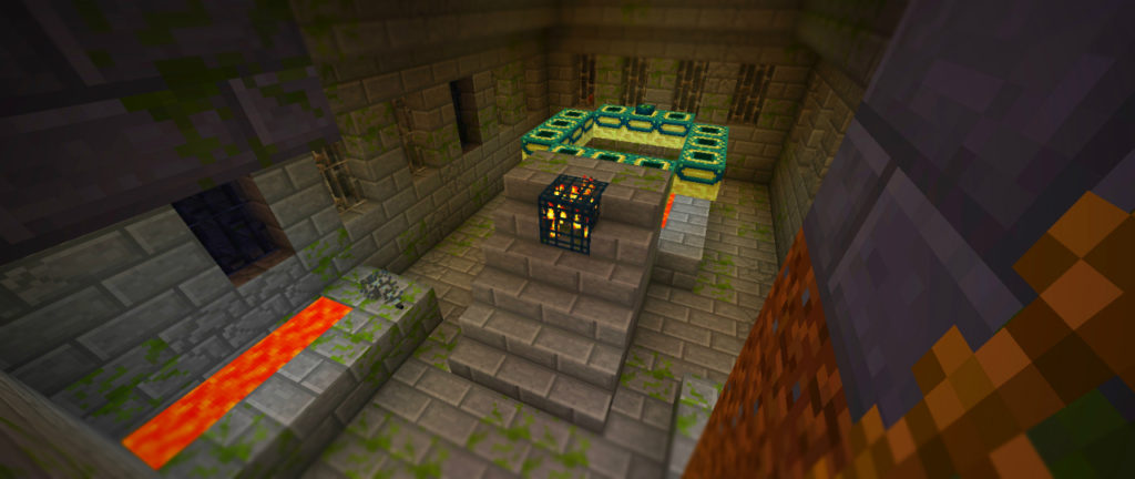 これがエンドポータル。中央部にあるスポーンブロックからは、小さな虫のような生物(※2)が湧きだしています。危険なので今はまだこの部屋には入らず、地上の湿地帯に目印をつけるだけにとどめます。いずれジ=エンドに赴くときに、再びこの場所を訪れることになるはずです。