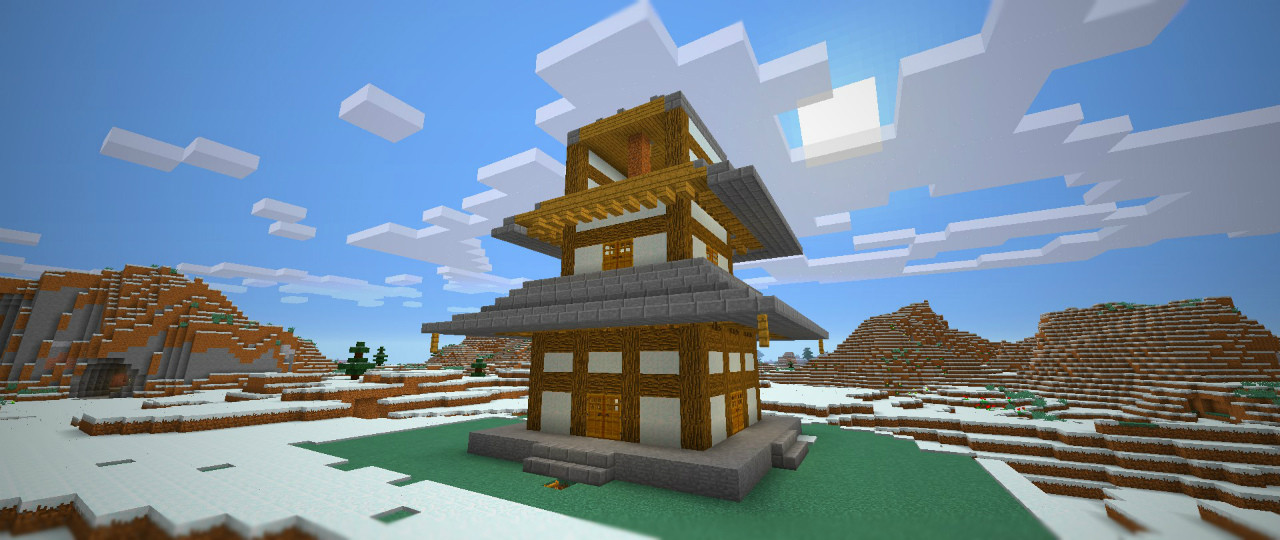 ちなみにこれ、興福寺の五重塔を参考にして作っています。ただ、マインクラフトの世界は雲の位置がやや低い(※1)ので雲を突き抜けない程度の大きさにするために3階建てに変更しました。それでもけっこうな高さになります。あまりに巨大な建築物は風景から浮いてしまうことがあるので悩みどころ。このブログの趣旨としては「ミニチュア感」を大事にしたいところです。理想としては小さくて地味な建物をたくさん並べて、ひとつの箱庭世界(※2)を作ってみたいものです。