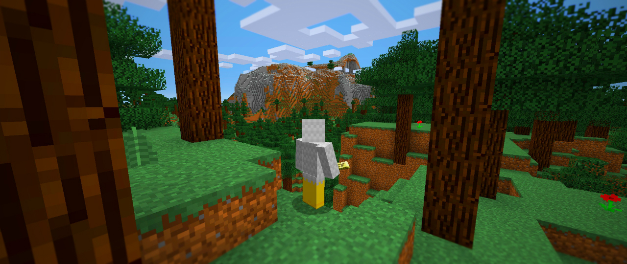 崖をよじ登り、旅を続けます。サバンナを抜けると今度は山岳地帯。これまた移動しづらい地形です。樹木が生い茂っている場所が多く、「葉っぱ」が意外と移動の妨げになります。元の土地に極力手を入れない方針で遊んでいるので壊してしまうわけにもいかず。現実の時間で小一時間ほども山と森をさまよいました。