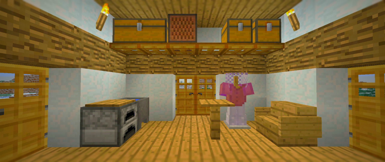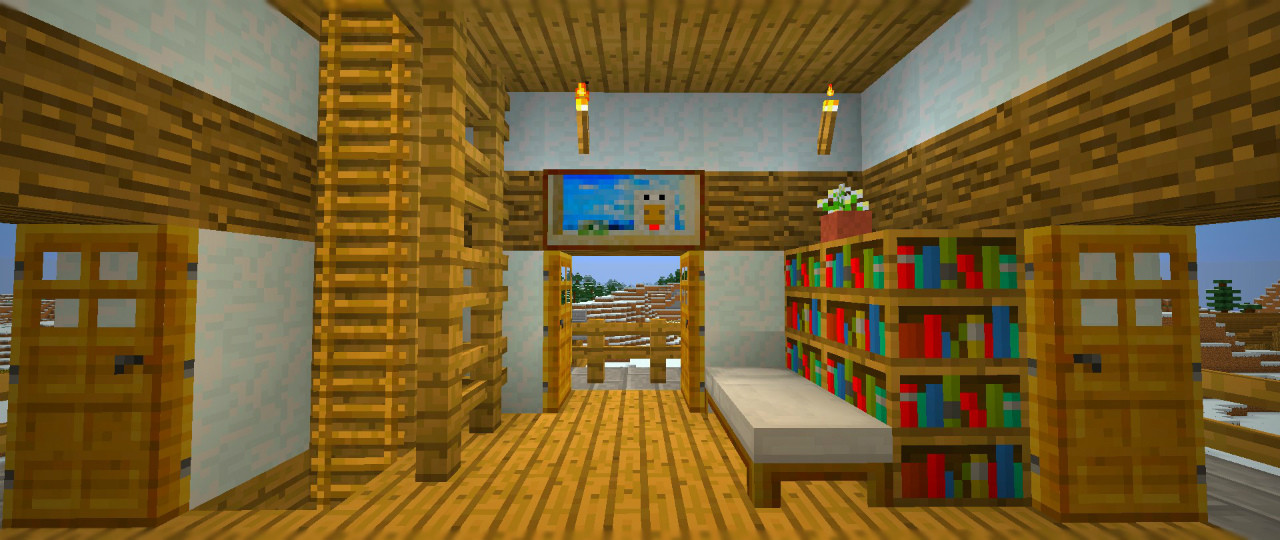 〔追記〕 今回の内装の変更にはリソースパックの機能を利用しています(※1)。デフォルトのグラフィックスの雰囲気が好きなのであまり改変する気はないのですが、ベッドの赤だけは気になるので変更しました。同じように、元から用意されている「絵画」のデザインも素晴らしいものなのですが(※2)、ちょとだけ変更させてもらいました。