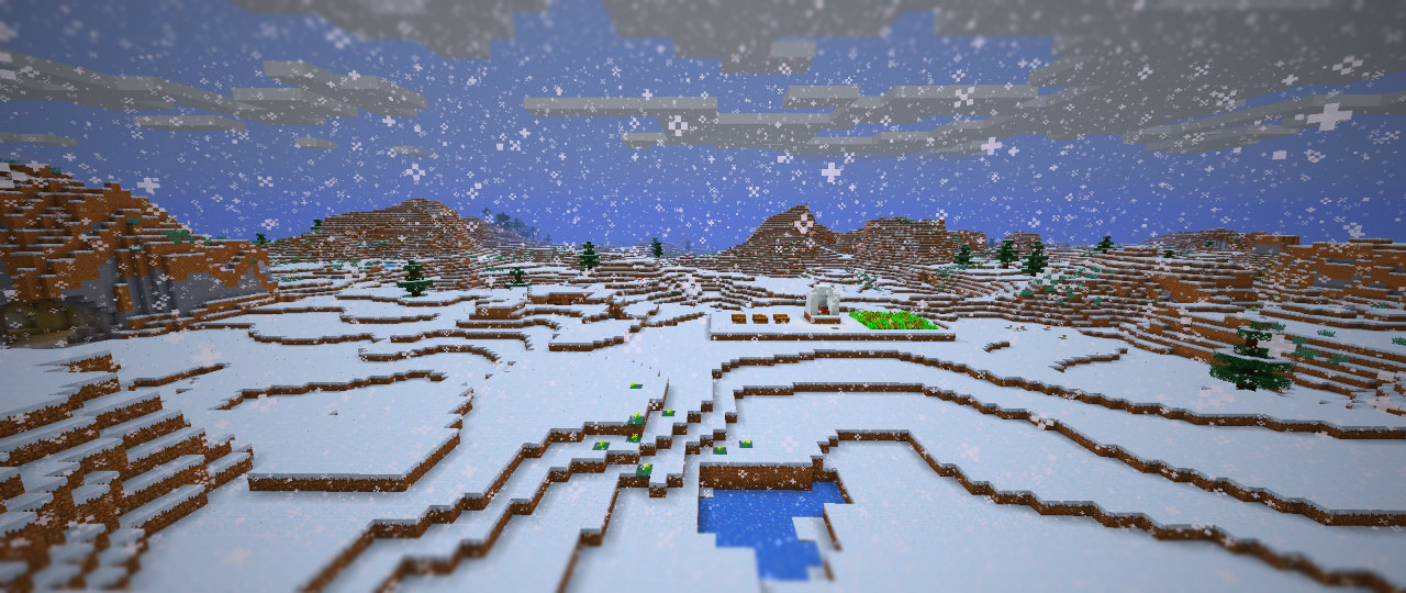 この土地にはよく雪が降ります。雪が降るとかなり視界が悪くなってしまいます。また、氷原では水が凍ってしまうので、凍結させたくない場所には屋根を付けなければいけないようです。温暖な地域に比べて少し生活の難易度が高いような気もするけれども、かえって雪国らしい雰囲気が出て良いかもしれません。さらに風情を出すために雪ブロックで小さなカマクラを作り、その中にベッドを入れ仮の住まいにしてみました。チェストはカマクラに入りきらないので野ざらしのまま6つ並べてあります。
