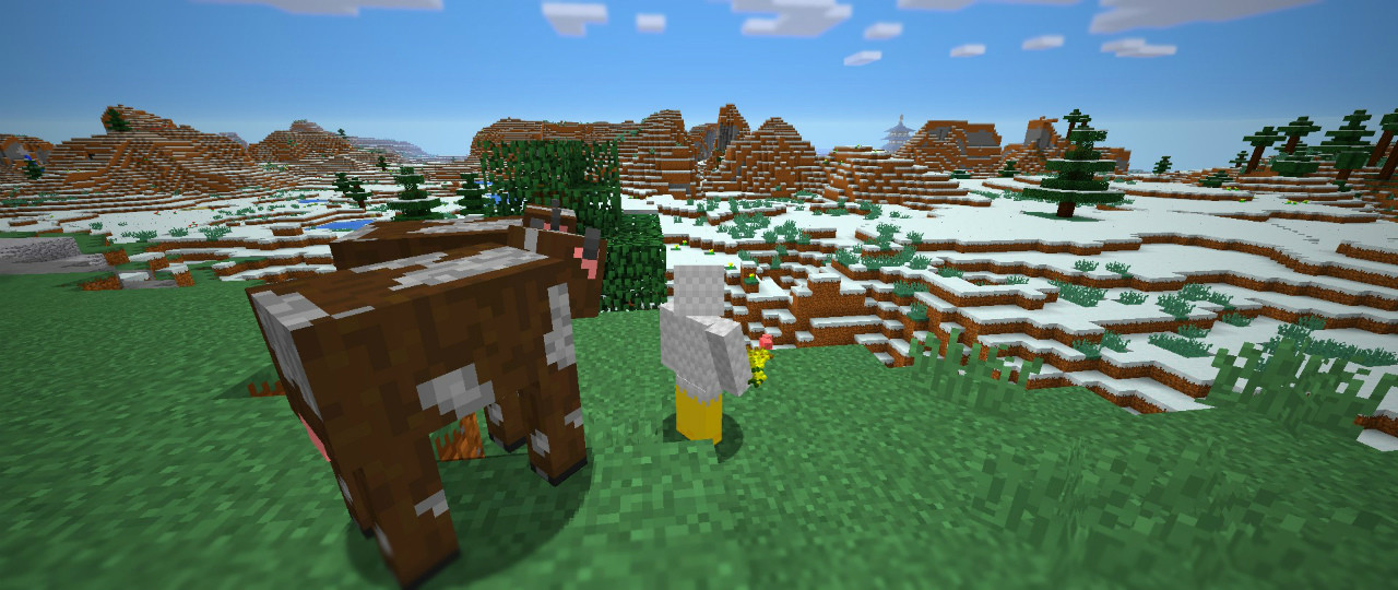 そのうち革が大量に必要になってくるので早い段階で牛を増やしておきたいのです。しかしこの辺り、羊を少しばかり見かけるだけで他の動物はまったく生息していません。しかたがないので温暖な地方まで足を伸ばして牛を連れてくることにします。牛は手に小麦を持っているとこちらについてくるので自宅まで誘導することができます(※1)。