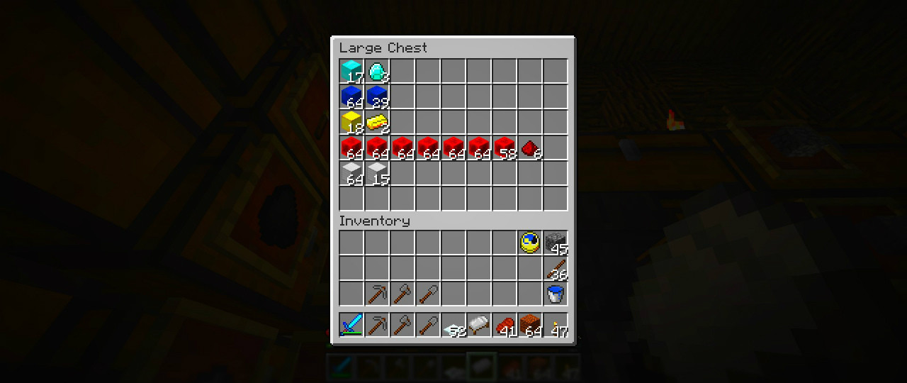 数としてはレッドストーンがダントツで多いですが、こんなにあっても使い道がありません。鉄インゴットのほうは道具やツールの素材として使う機会が多いので掘った数よりも少し目減りしています。意外に金がダイヤモンドと同じくらいに少ないですが、これは「Fortune」で増やすことができないからだと思われます。金はトロッコのレールを敷くときに大量に使うことになるでしょうから(※2)、もう少し集めておきたいところ。