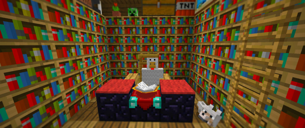 立派な書斎をこしらえました。黒曜石で作られた書き物机に、背もたれ付きの肘掛け椅子。周囲は作り付けの本棚に囲まれ、落ち着きのある空間を演出しています。