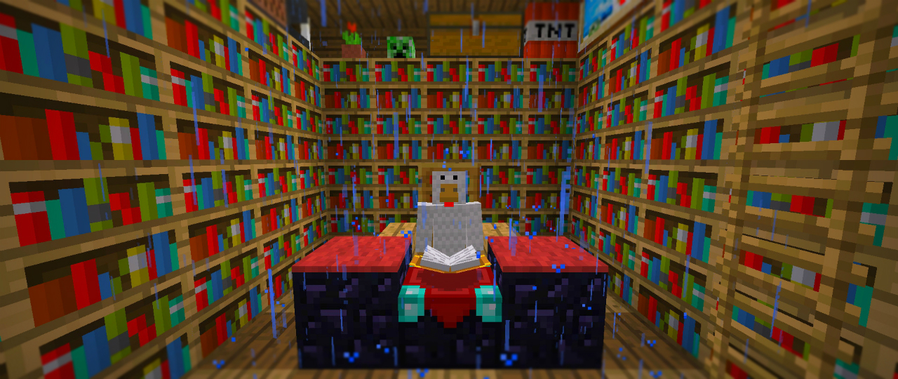 立派な書斎をこしらえました。黒曜石で作られた書き物机に、背もたれ付きの肘掛け椅子。周囲は作り付けの本棚に囲まれ、落ち着きのある空間を演出しています。