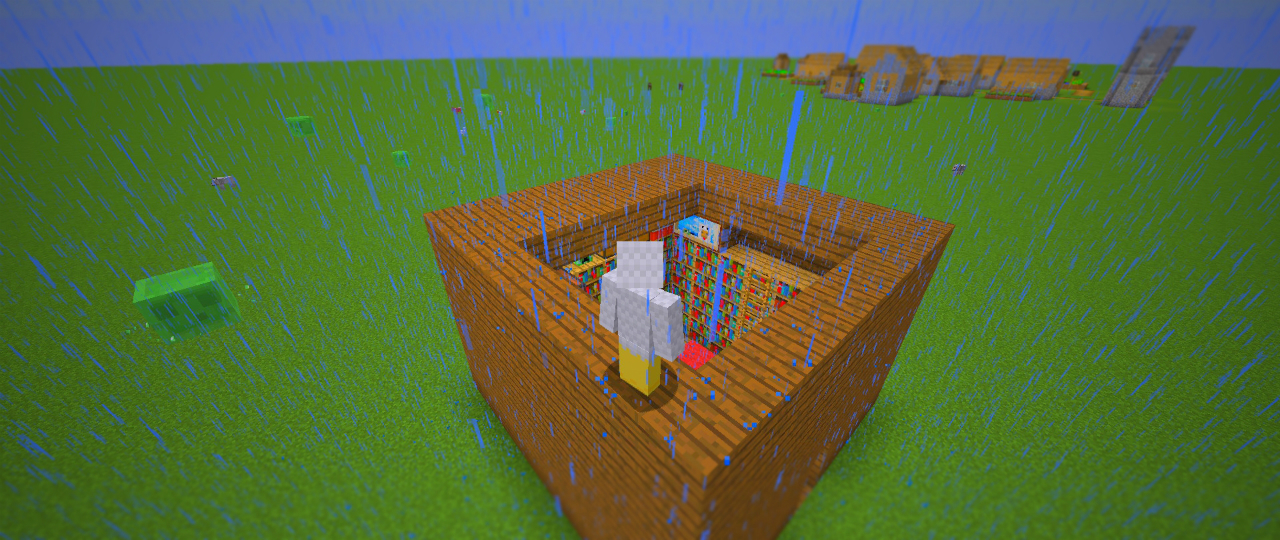 ※1 最初は屋根をつけて撮影したのですが、光量が足りず暗い画像に。結果としてこういう形になりました。 ※2 クリエイティブモード・スーパーフラット(どこまでも平らな世界を生成するモード)で作成しました。