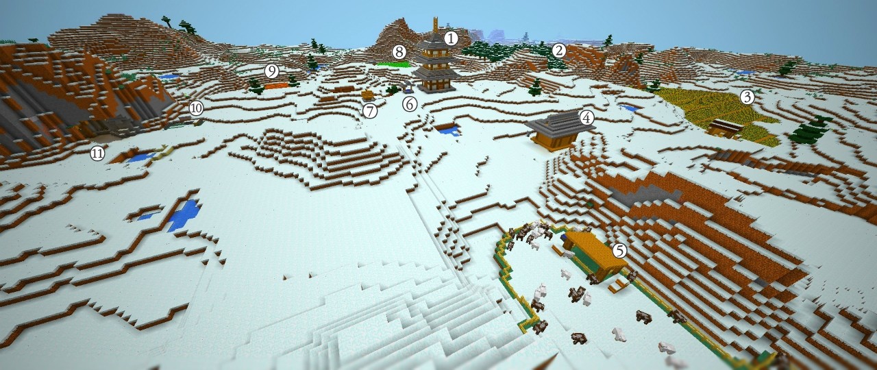 02.20 0 鳥瞰図4 Posted by suzuki in Minecraft 位置関係を分かりやすくするために、画像内に数字をふってみました。 ① 自宅 ② 植林場 ③ 小麦畑 ④ エンチャント小屋 ⑤ 牧場 ⑥ 井戸 ⑦ 雪だま製造機 ⑧ サトウキビ畑 ⑨ カボチャ畑 ⑩ 石材置き場 ⑪ 坑道入口 施設が増えてくるにしたがって道や階段などが無いと移動にロスが多く、不便に思えてきました。このあたりもいずれ改善していきたいものです。 あ、「カボチャ畑」と「石材置き場」は工事中です。 icon-arrow-circle-right次の記事へ
