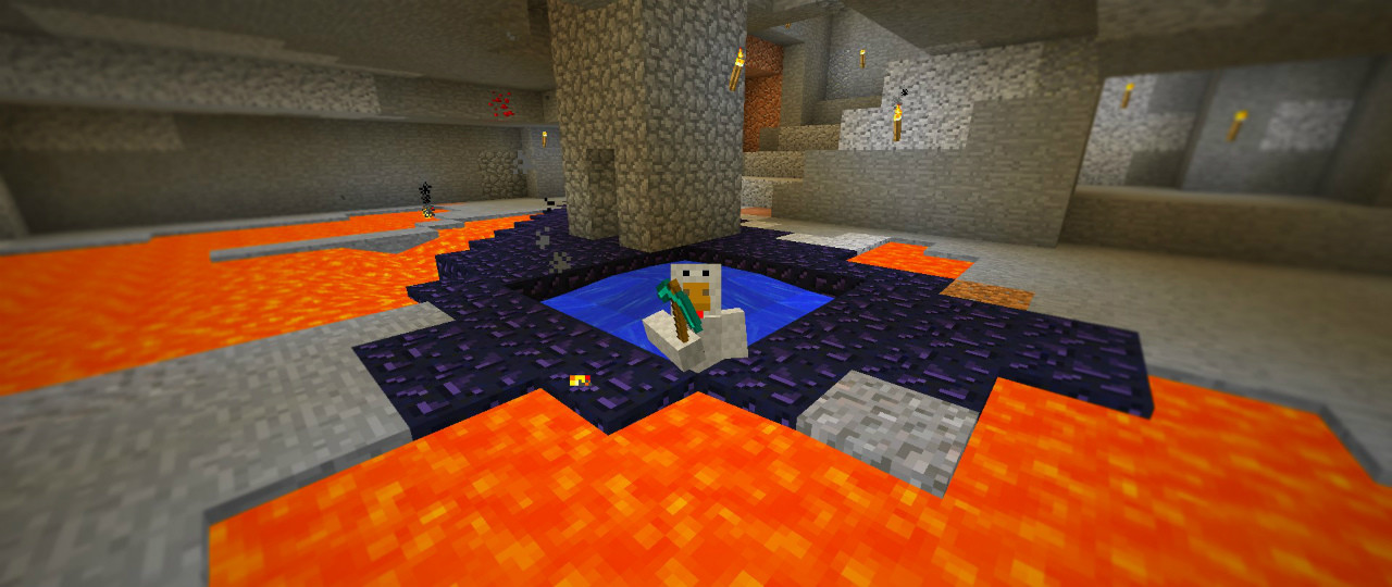黒曜石の真下は溶岩であることが多いので普通に掘ると危険です。対策として水を流しながら作業をします。こうすると、溶岩は流水に触れた瞬間に黒曜石へと変わり、焼死を防いでくれます。