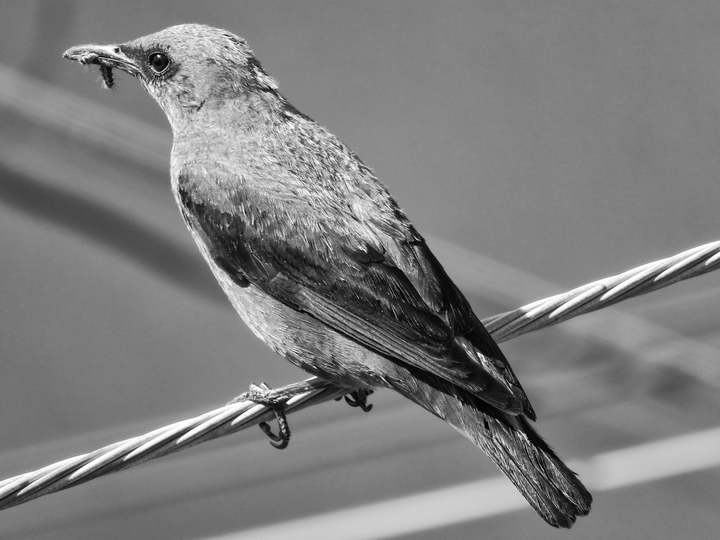 窓の外を見ると、イソヒヨドリのオスが餌を運んでいました。