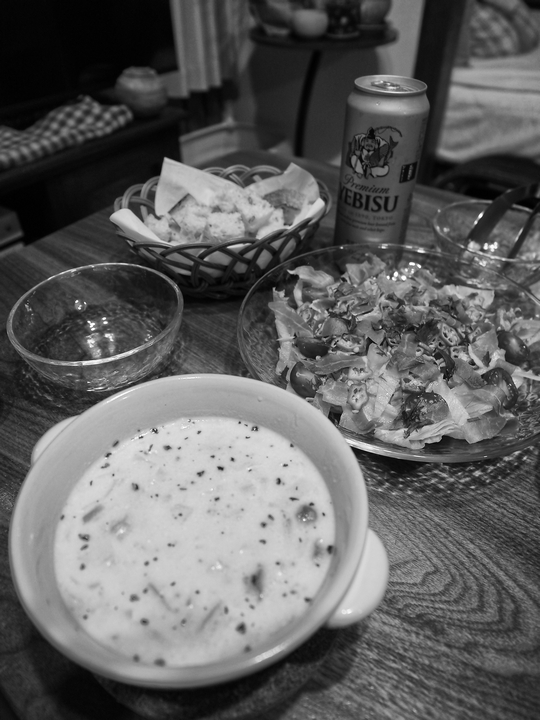 「10年に一度」の酷暑が続き、外出して写真を撮るのが億劫です。42℃とか、人生で初めて体験しました。写真は夕食のスープとパン、サラダ。