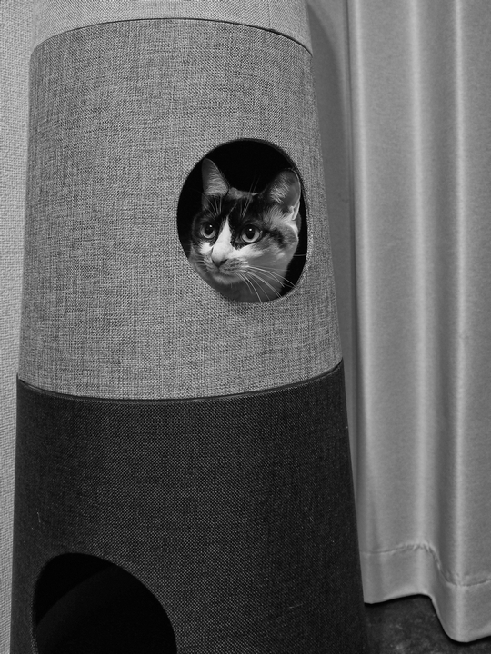 新しく買ったキャットタワーで遊び、ご満悦な猫。