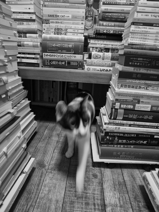 勝手に書斎に入り込み、本の隙間を逃げ回る猫。