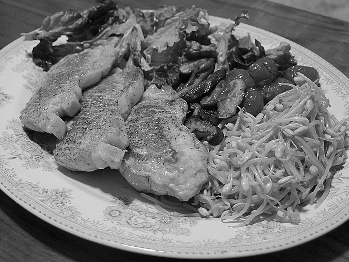 豚肉が安く売っていたので焼いてみました。味付けはシンプルに塩コショウのみ。にんにくチップを乗せていただきます。