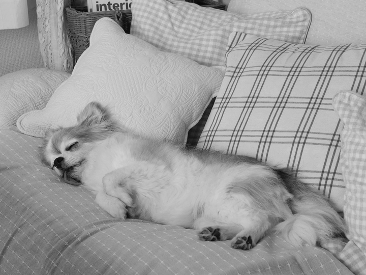 ソファーはチワワ父のお気に入りの場所。最近は暑い日が多くなってきているので、服を着せていません。
