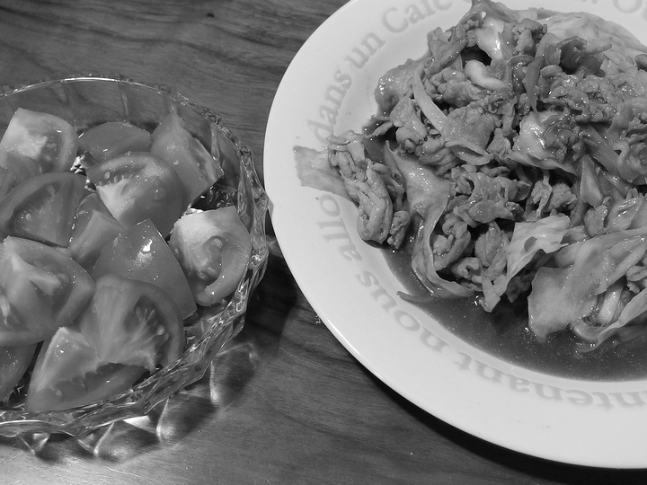 2016年8月20日 日々 回鍋肉風 甜麺醤と豆板醤、その他醤油や酒や片栗粉などを混ぜてタレにします。具材は豚肉とキャベツのみ。トマトは塩をかけただけ。(毎度のことながら)手間をかけない食事です。 suzuki