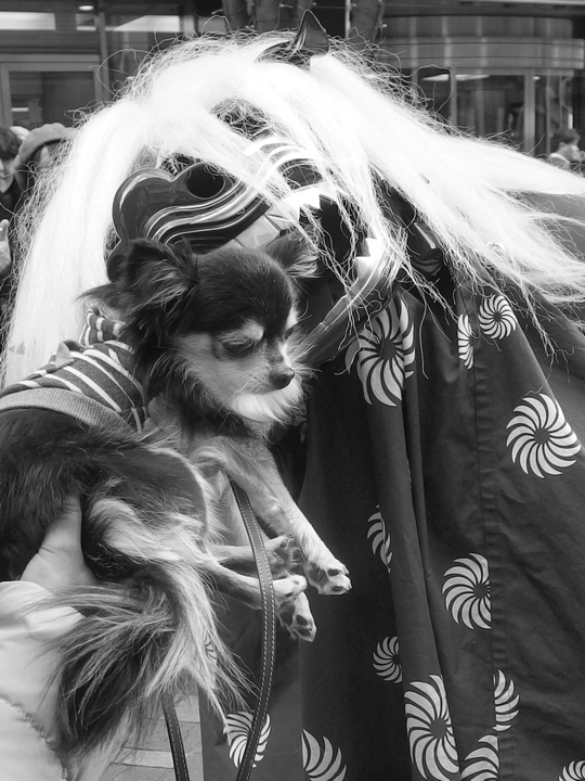 獅子舞に噛まれるチワワ息子。