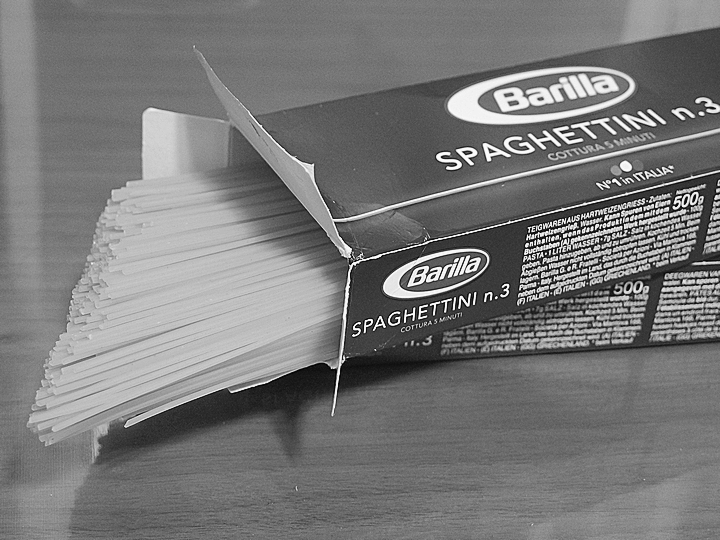 イタリアの乾燥パスタで有名なものに「barilla(バリラ)」と「dececco(ディチェコ)」がありますが、私は前者をよく使います。適当に茹でてもグダグダになりにくく、調理が簡単なのがその理由。写真は太さ1.4mmのロングパスタ、「スパゲッティー二」。