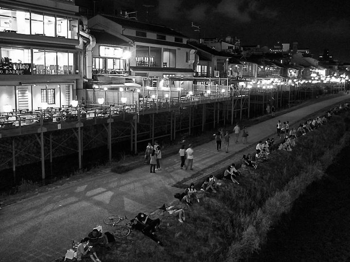 帰りがけに撮影した鴨川沿いの風景。「川床」が設置され、川べりも人々で賑わっていました。京都の夏らしい風情です。