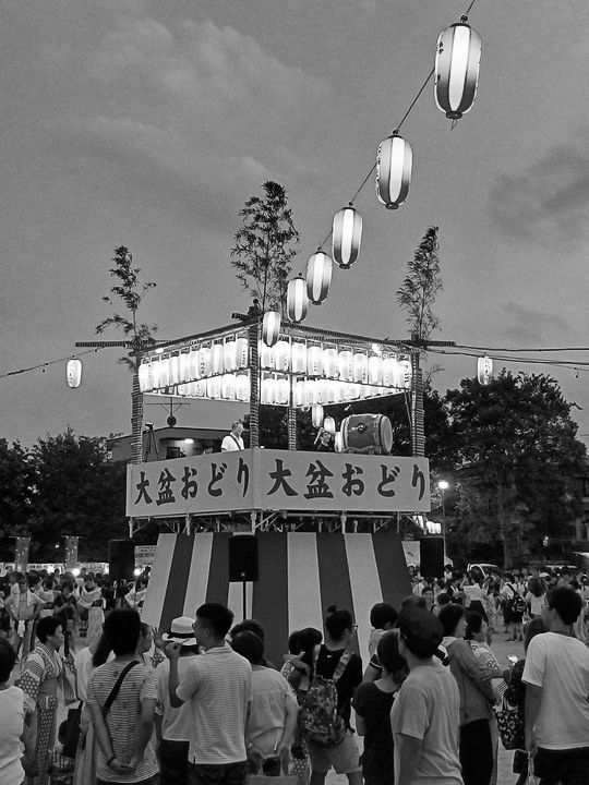 この時期は、あちこちで盆踊りが催されます。今夜はもう8時になるというのに気温が30度ほど。ただでさえ蒸し暑い上に屋台料理のガス火と、人々の熱気で大変なことになっています。