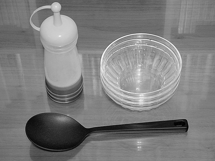 “雑品記事”その3は「料理道具」です。左上は百均の調味料ボトル、材料を入れて振るだけでドレッシングが完成するので便利。右上も百均のプラスチック皿ですが、下ごしらえをした食材を入れておく為の必須アイテム。下は無印良品のシリコン調理スプーンで、「混ぜる」「掬う」の二役に使えます。
