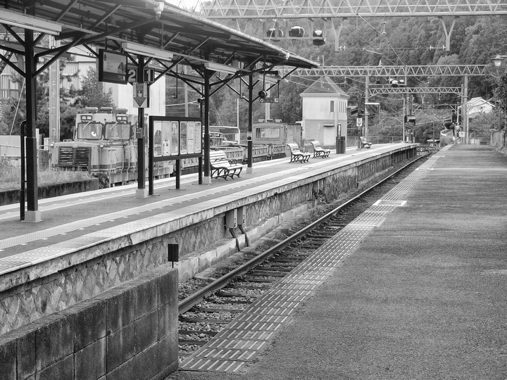 電車で帰ります。ホームの後ろに停車しているのは、貨物列車の一種でしょうか。