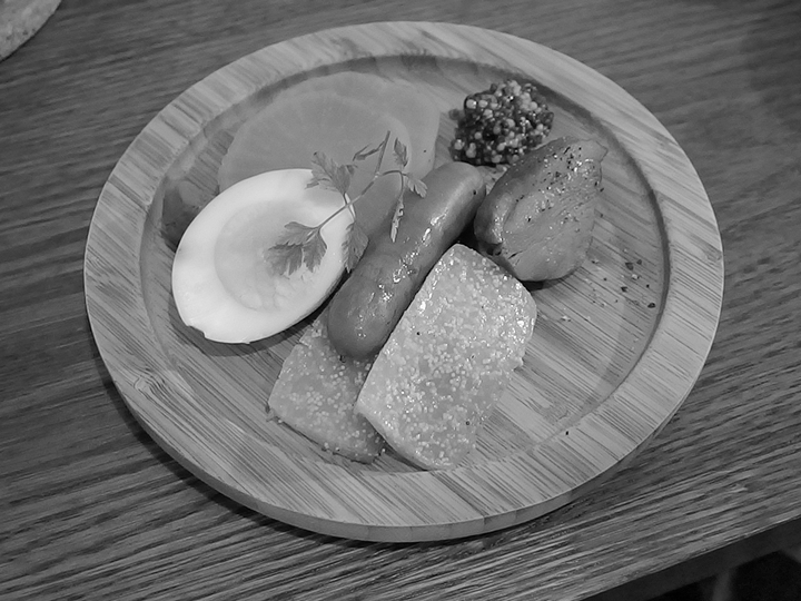 クエ鍋でお腹が落ち着いたのであとは酒の肴を。迷いましたが「燻製盛り合わせ」などを頼んでみました。出てきたのは卵・沢庵・ソーセージ・合鴨・子持ちこんにゃく。「子持ちこんにゃく」は広島県の珍味で、コンニャクの中にシシャモの卵が入っているそうです。