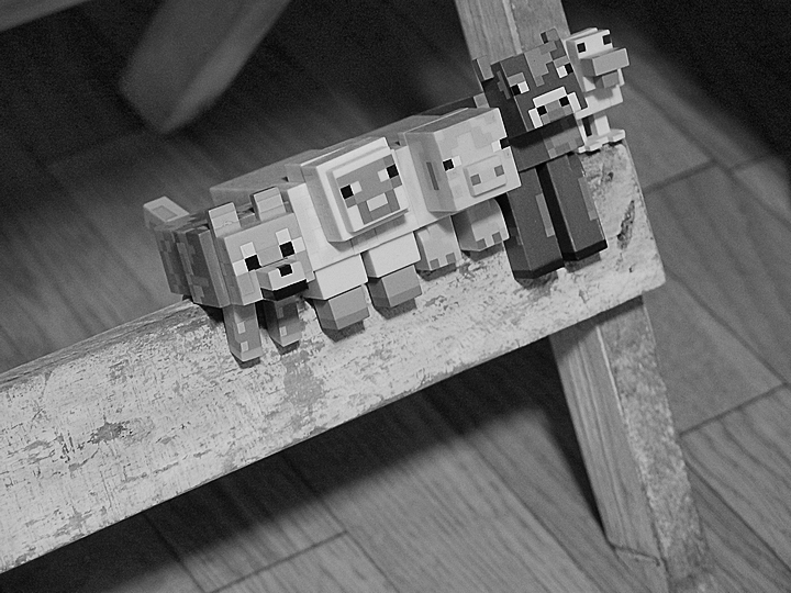 2017年11月30日 日々 動物玩具 「マインクラフト」の動物たち。最近は木製ベンチの足に置いてあるのですが、犬に体当りされて床に落ちることが多いです。追記:「ヤマネコ」だけ別の場所に飾られていて不在。 suzuki