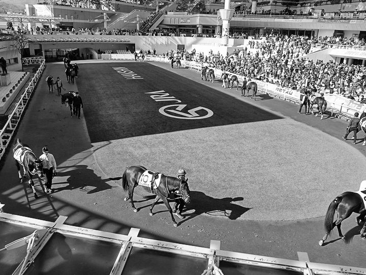 「蚤の市」は競馬場の敷地の一部で催されています。せっかくなのでコチラも見物していきましょう。写真は「下見所(パドック)」の様子。