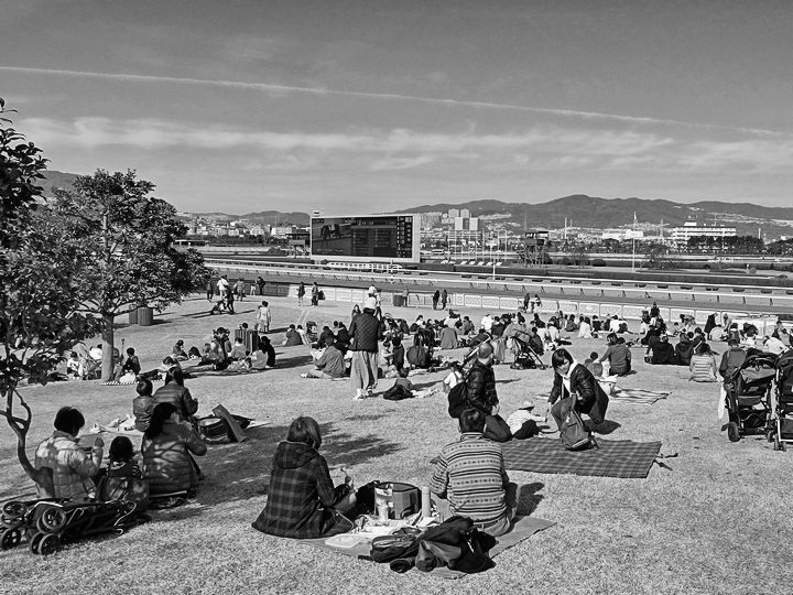 本馬場の前には芝生が敷かれていて、人々が憩っています。場内にはフードコートもあり、家族連れの姿も目立ちます。