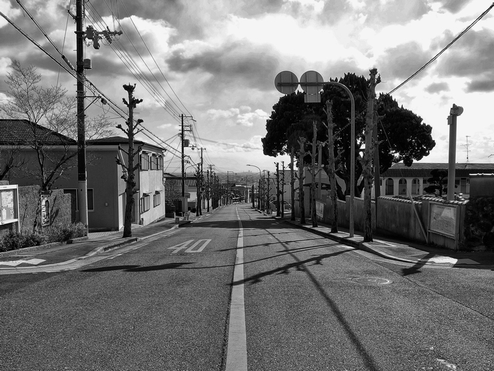 散歩中、車の往来がなかったので車道の真ん中から一枚撮影してみました。地味な日常風景ですが、不思議な静謐さを感じます。