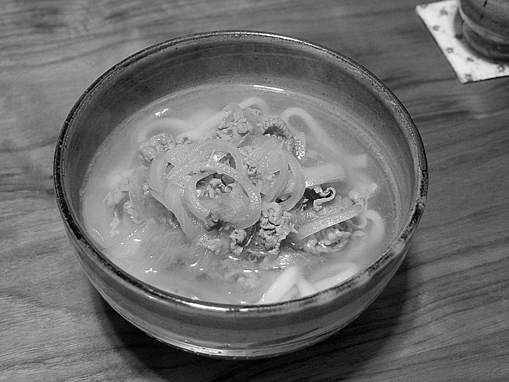 今日の夕食は簡単に「肉うどん」で済ませました。牛コマ肉は安くて良いです。