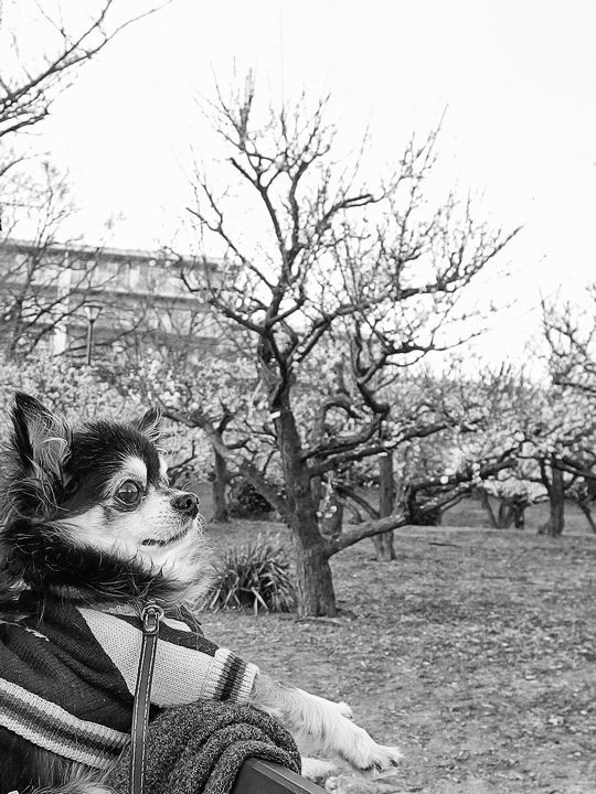 梅の花にはさほど興味がなさそうなチワワ息子。