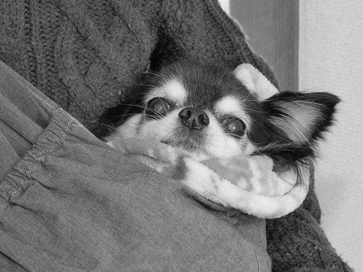 「ドッグスリング」に収まったチワワ息子。この体勢が落ち着くようで、この顔。