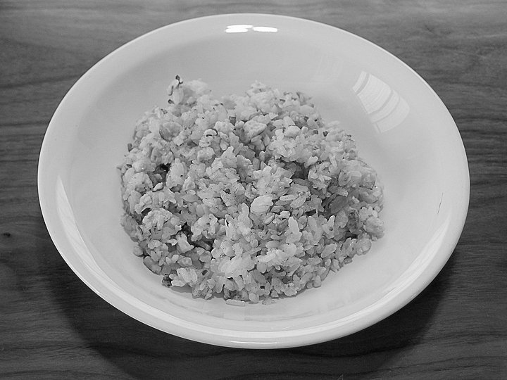 昼食の炒飯(チャーハン)。ウー=ウェンさんの『大好きな炒めもの』を参考に作りましたが、ちょっと火を通しすぎた感じ。炒めものは難しい。