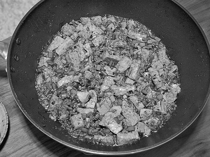 夕食は『大好きな炒めもの』から麻婆豆腐を。主な味付けは豆豉(トウチ)・花椒(ホアジャオ)・一味唐辛子など。具材は豆腐に大蒜の芽、豚ひき肉。