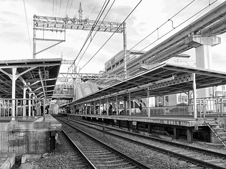 5月は散歩日和が続きます。踏切から駅のホームを見渡せる場所を見つけ、なんとなく一枚撮影。