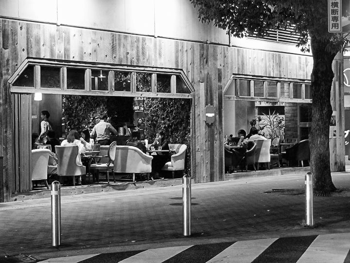 高架下のレストランで遅めの夕食を楽しむ人々。お腹が空いてきました。