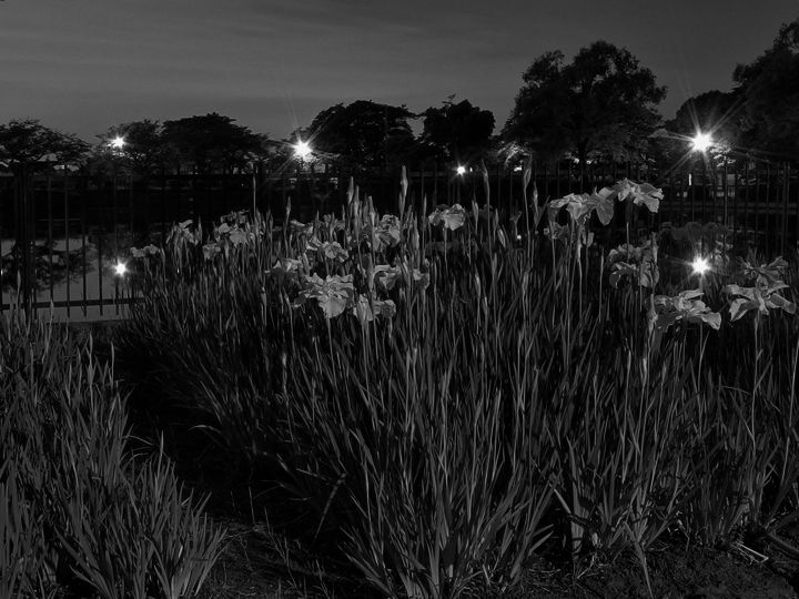 暗闇に白く浮かび上がる花菖蒲。夜の雰囲気を写真で再現するのは、思ったよりも難しいです。