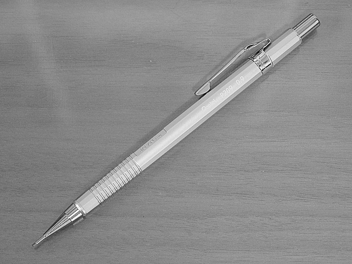 ぺんてる社のシャープペンシル、「p200系」。そのシルエットの美しさに思わず衝動買い。写真のタイプは芯の太さが0.9mmなので「p209」という型番です。軸の色はモデルによって様々のようですが、今回手に入れたのは淡い金色のもの。